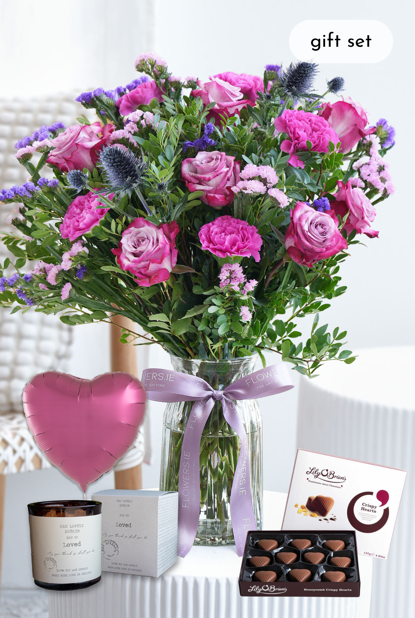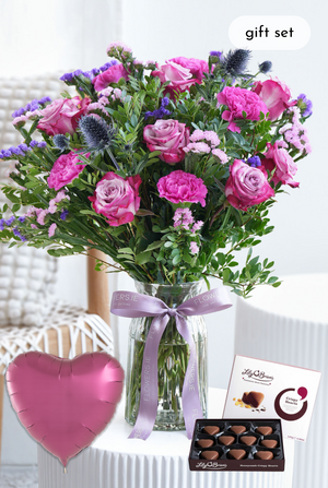A striking blend of purple roses, carnations, statice, thistles, and pistach leaves. Rich in color and texture, it’s the perfect gift to impress with elegance and sophistication.