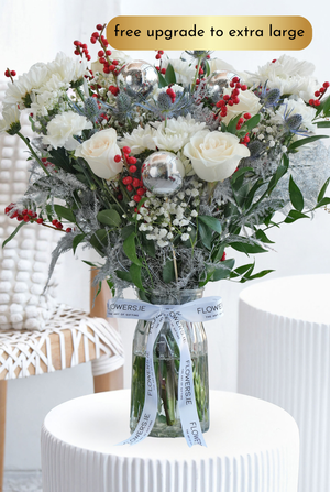 Elevate your holiday gifting with our Perfect White Christmas Vase, featuring elegant white roses, carnations, chrysanthemums, gypsophila, red ilex, blue thistle, silver asparagus fern, ruskus leaves, and festive silver baubles. This exquisite arrangement captures the essence of a perfect white Christmas for you and your loved ones.