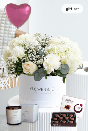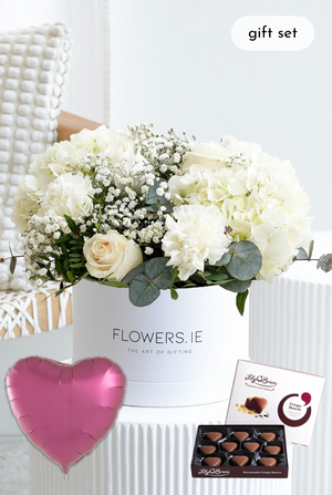 Indulge in the pure and serene beauty of our Perfect White Hatbox arrangement, featuring pristine white hydrangeas, classic white roses, delicate gypsophila, and fresh pistach leaves. This elegant and timeless bouquet is the perfect way to brighten up any space and create a sense of peace and tranquility.