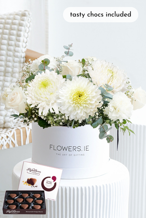 Our White Serenity Hatbox blends white roses, carnations, chrysanthemums, and gypsophilia with pistach greenery and eucalyptus. Stylishly presented in a hatbox, it is the perfect elegant gift to brighten any occasion.
