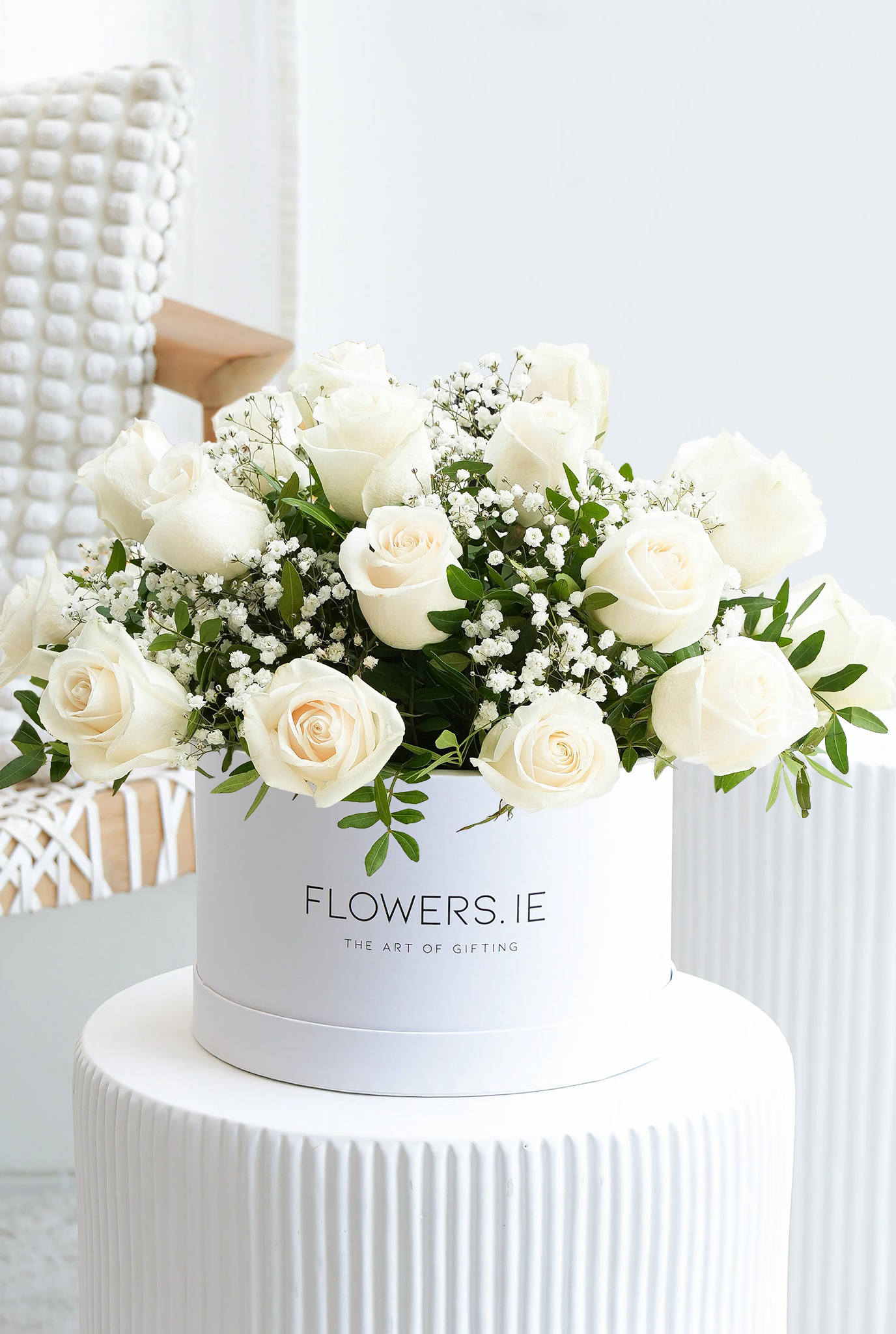 Celebrate Women's Day in elegant style with our Women's Day Ivory Bliss Hatbox. This exquisite arrangement features large-headed white roses, delicate gypsophila and pistacia leaves, beautifully arranged in a chic hatbox, creating a timeless and sophisticated gift that perfectly captures the essence of admiration and appreciation for the remarkable women in your life.