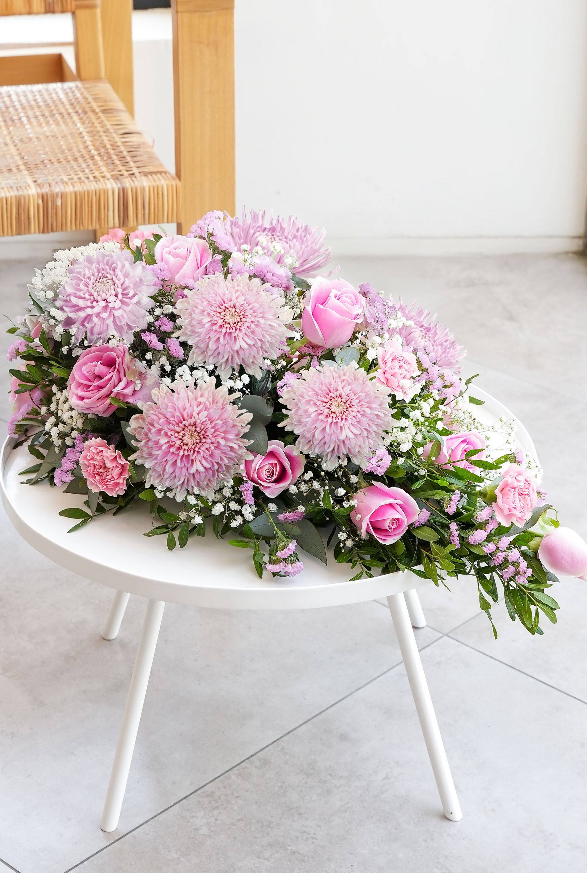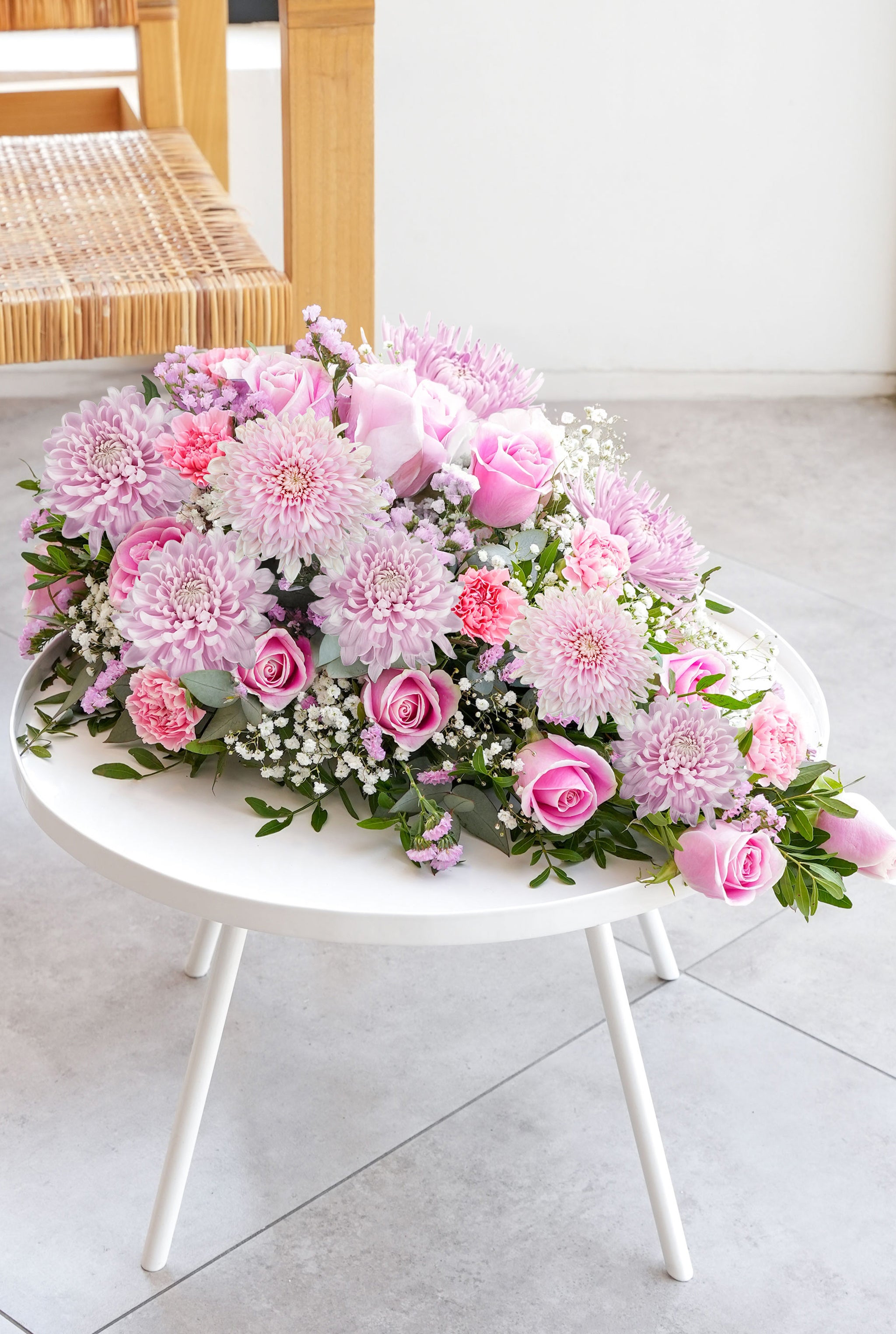 Our Pink Delight Funeral Spray is a serene tribute with pink roses, gentle carnations, pink chrysanthemums, pistach greenery, and eucalyptus—perfect for honoring the memory of a cherished life.