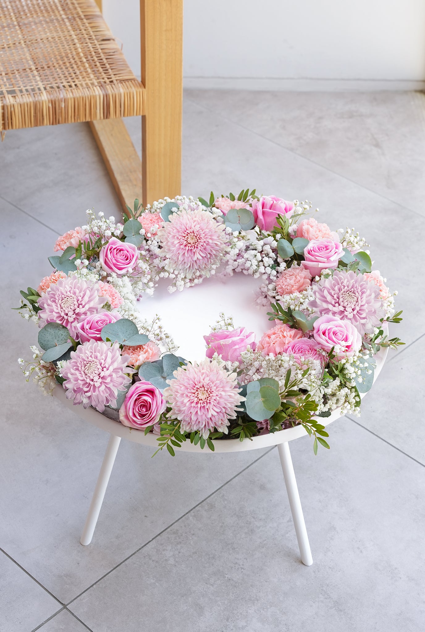This Pink Delight Funeral Wreath is a serene tribute with pink roses, soft carnations, delicate gypsophila, pink chrysanthemums, pistach greenery, and eucalyptus—perfect for honoring a cherished life.