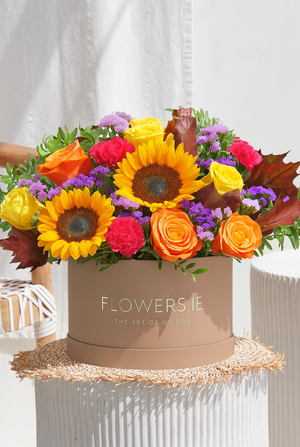 Celebrate autumn with our vibrant hatbox arrangement of yellow and orange roses, cerise carnations, sunflowers, and autumn leaves. It's a perfect gesture for birthdays, anniversaries, or any special occasion.