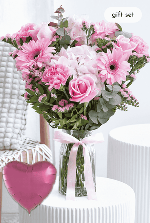 Bring elegance and warmth with pink roses, delicate carnations, cheerful gerberas, and pink hydrangea, accented with pink statice, pistach greenery, and eucalyptus—perfect for celebrating love, friendship, or brightening someone’s day.