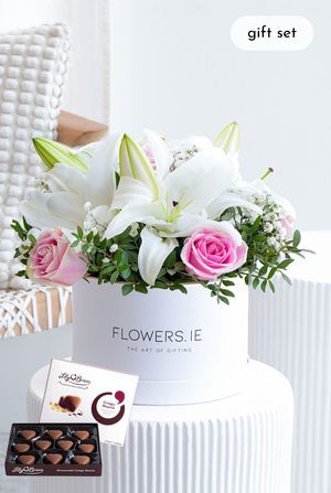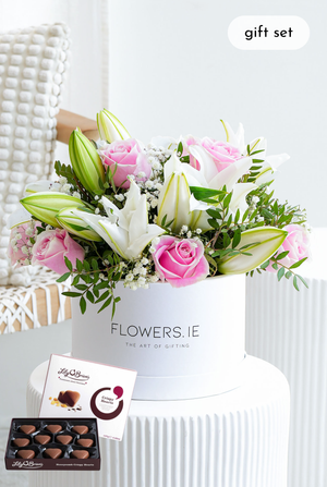 Elevate your floral gifting with our Pink Roses and White Lily Hatbox, a stunning arrangement that combines the timeless elegance of delicate pink roses with the purity of white lilies. Nestled in a stylish hatbox, this enchanting floral ensemble not only captivates the senses but also serves as a luxurious and thoughtful gift for any special occasion.