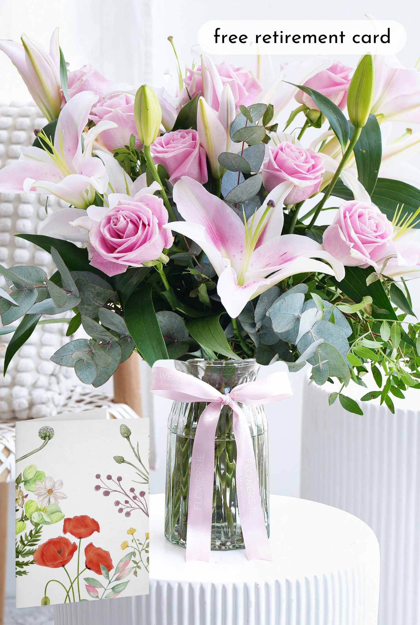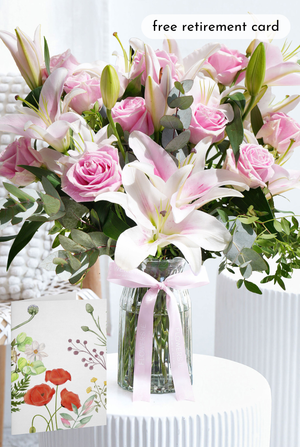 Celebrate retirement with a touch of natural beauty — elegant pink roses and lilies arranged with fresh eucalyptus, a graceful display that conveys appreciation, joy, and best wishes for a bright new journey ahead.