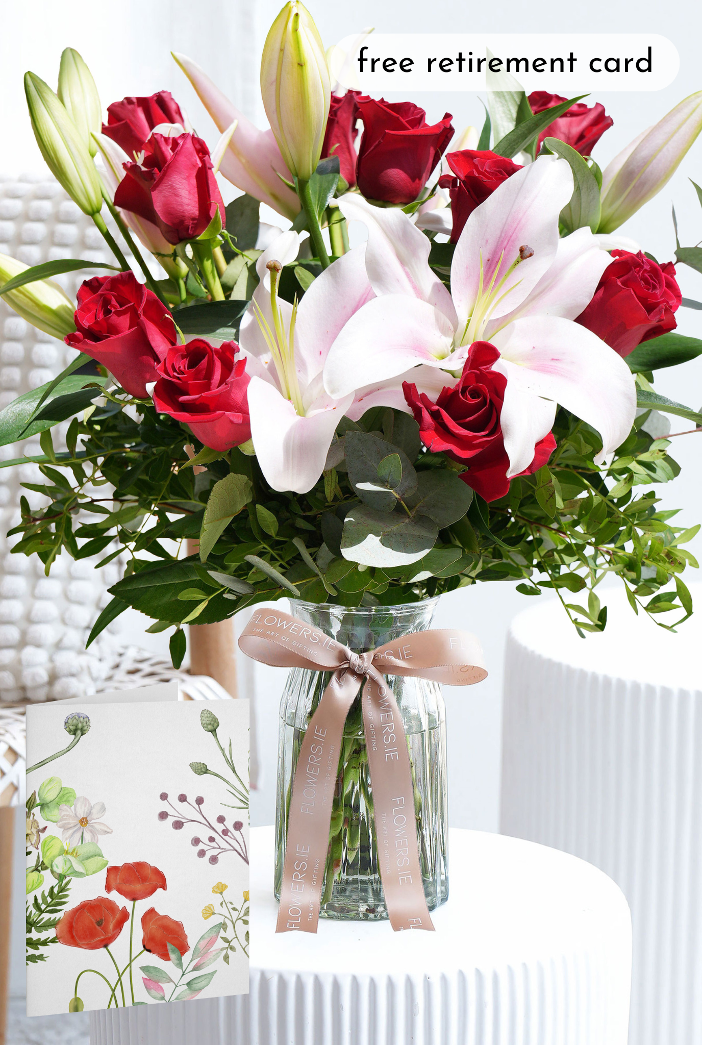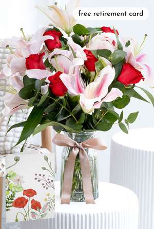 Celebrate a well-earned retirement with elegance and grace — a stunning vase of red roses and pink lilies complemented by fresh eucalyptus leaves. Expertly arranged, this luxurious bouquet symbolises appreciation, success, and the beauty of new beginnings.