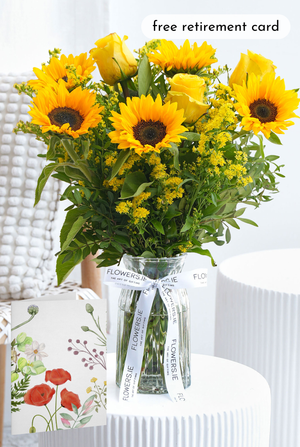 Celebrate retirement with this radiant sunflower arrangement — a joyful blend of sunflowers, yellow roses, solidago, and lush greenery that shines with warmth and positivity. A perfect way to honor achievements and brighten the start of a new chapter.