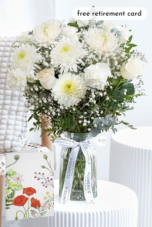 Welcome back with timeless grace — white roses, carnations, chrysanthemums, and gypsophilia, elegantly arranged with pistach greenery and eucalyptus, symbolizing purity, love, and new beginnings.