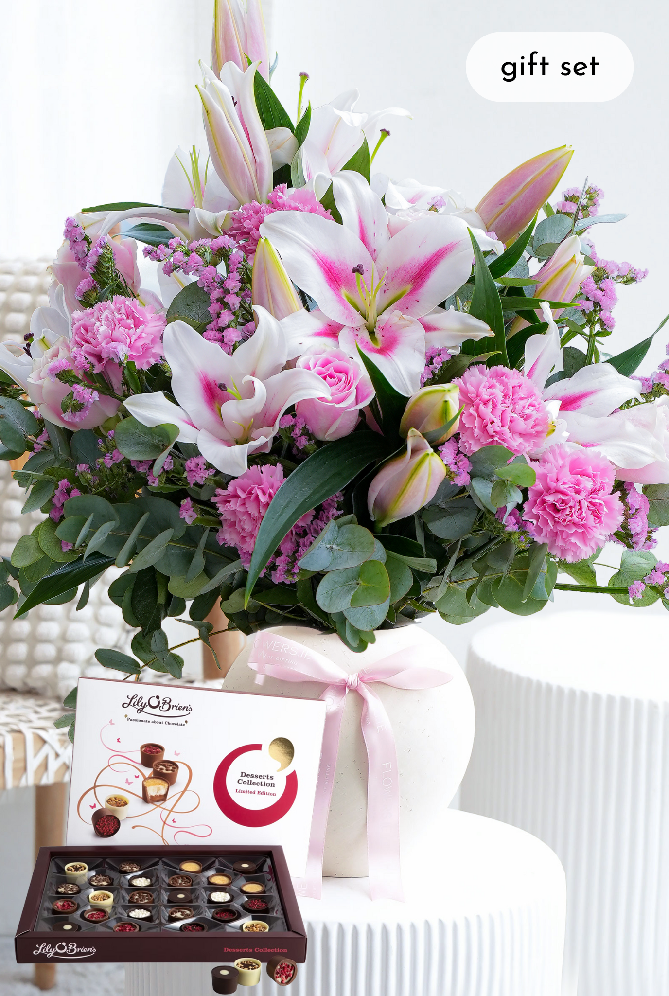 For this magnificent display, we’ve chosen fresh pink "Dalian" oriental style lilies with Carnation pink and pink