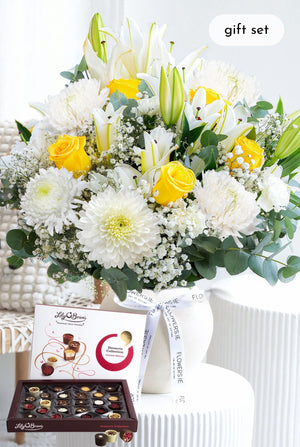 Our "Wonderfully Cheer" bouquet in a ceramic vase from our luxury range, features a beautiful combination of yellow roses, white carnations, white hydrangeas, white lilies, and gypsophila arranged in a stylish ceramic vase. This stunning arrangement exudes elegance and grace, making it the perfect gift for any special occasion.