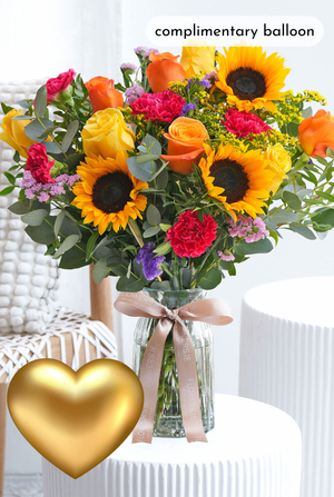 Welcome back with sunshine and smiles — a joyful mix of sunflowers, vibrant roses, and colorful statice to brighten the room and lift every heart.