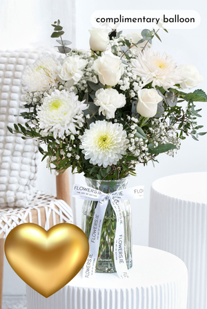 Welcome back with timeless grace — white roses, carnations, chrysanthemums, and gypsophilia, elegantly arranged with pistach greenery and eucalyptus, symbolizing purity, love, and new beginnings.