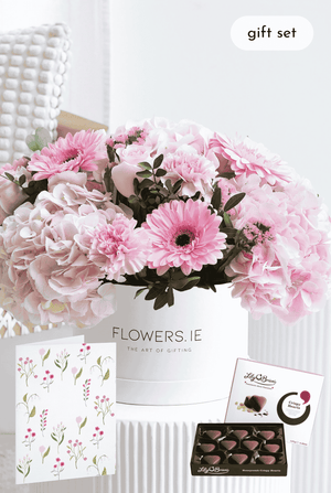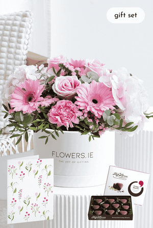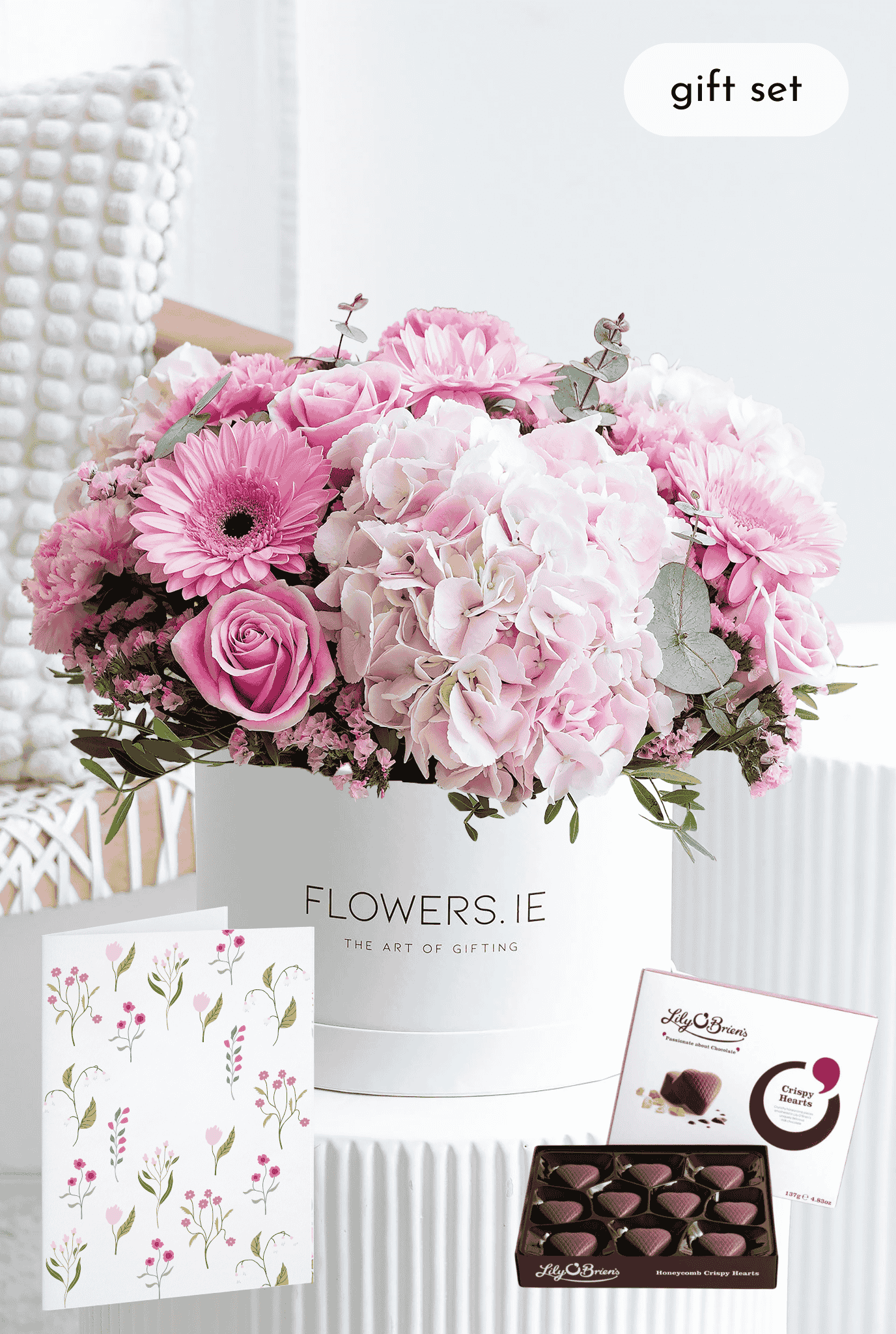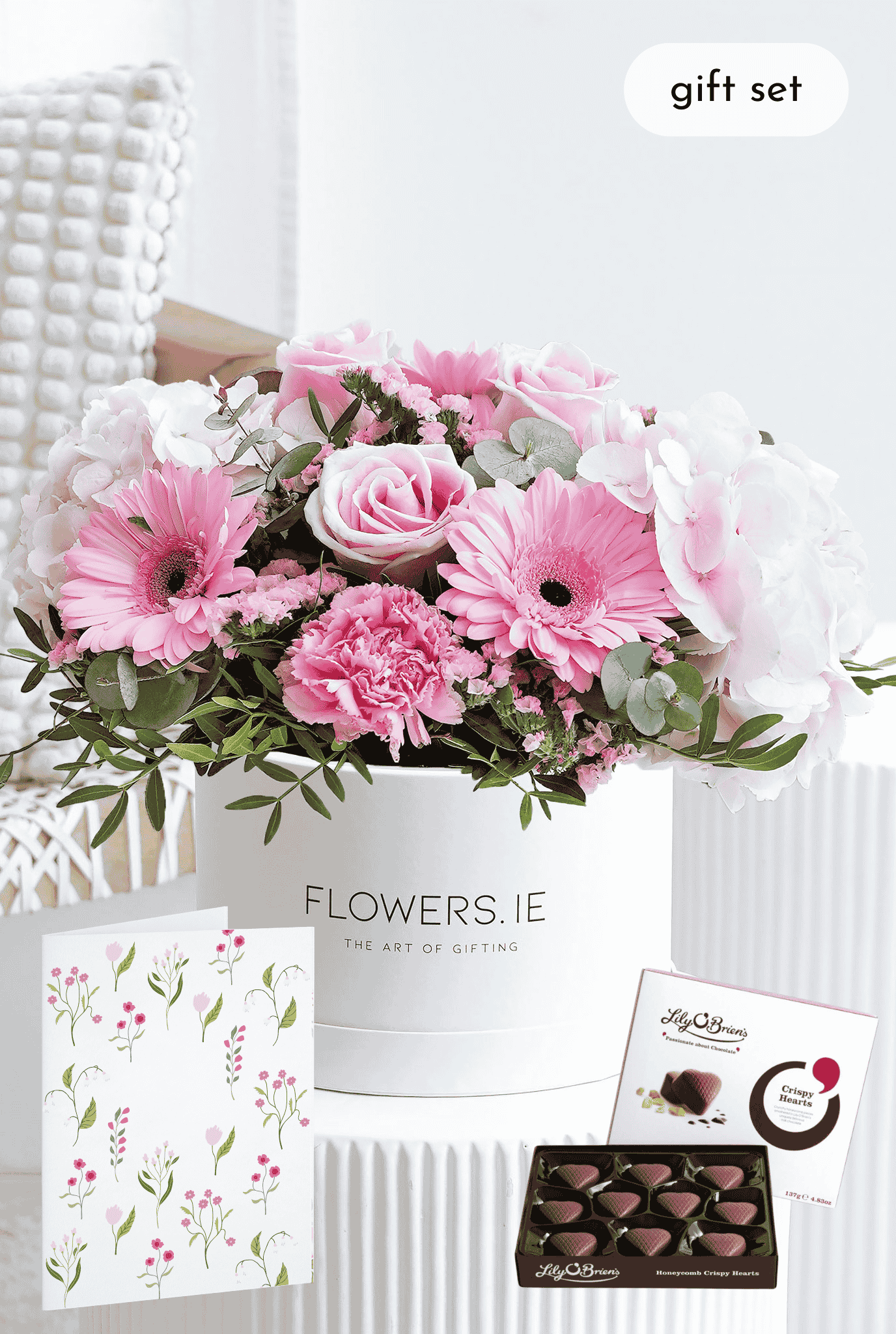 Surprise your Mam this Mother’s Day with our Pretty Pink Hatbox—an elegant mix of pink hydrangea, roses, gerbera, carnations, and statice, accented with pistach and eucalyptus leaves. Beautifully arranged in our signature hatbox, it’s a heartfelt way to show your love and appreciation!