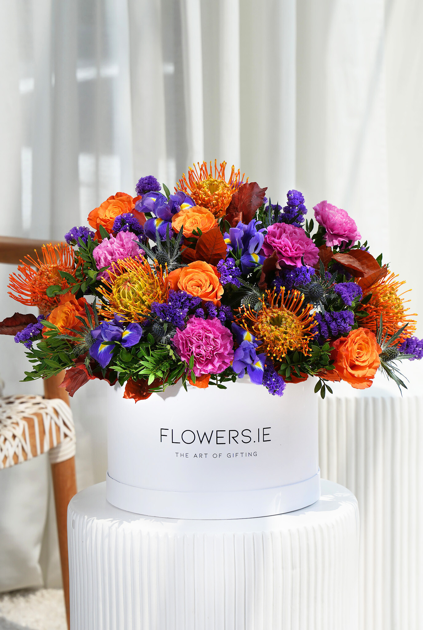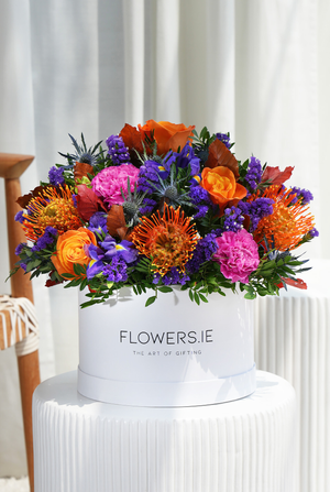 Introducing Amber Glow, a striking hatbox arrangement bursting with bold orange roses, rich purple carnations. Accented with nutan, thistles, statice, and oak leaves, this luxurious design radiates elegance and beauty, making it a gift to truly impress.