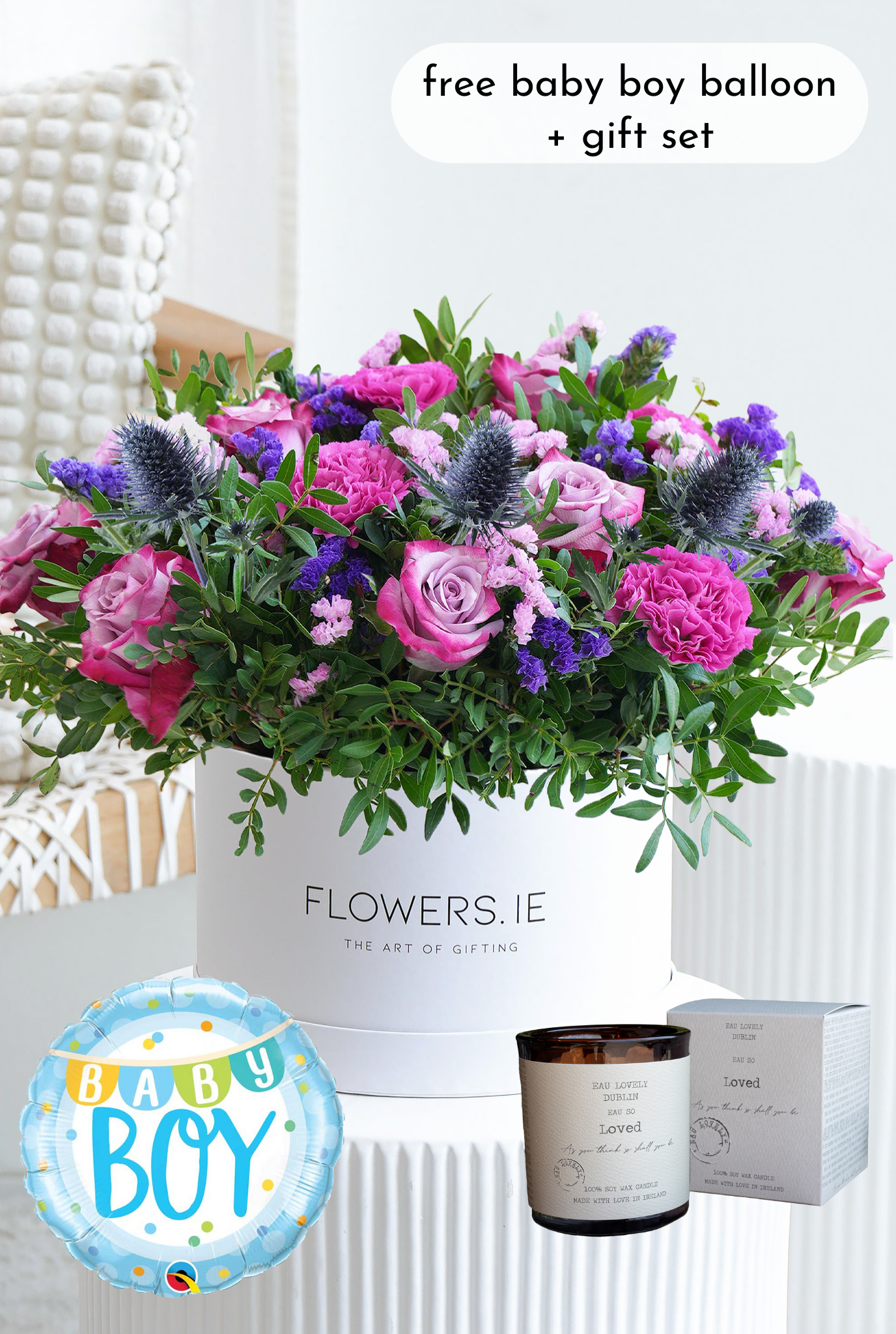 Welcome a new baby boy with the charming elegance of our Lavender Floral Hatbox. Featuring deep purple roses, blue statice, textured purple carnations, and thistles, accented by pistacia leaves for a fresh touch of greenery, this arrangement is a thoughtful and sophisticated way to celebrate the joyful occasion.