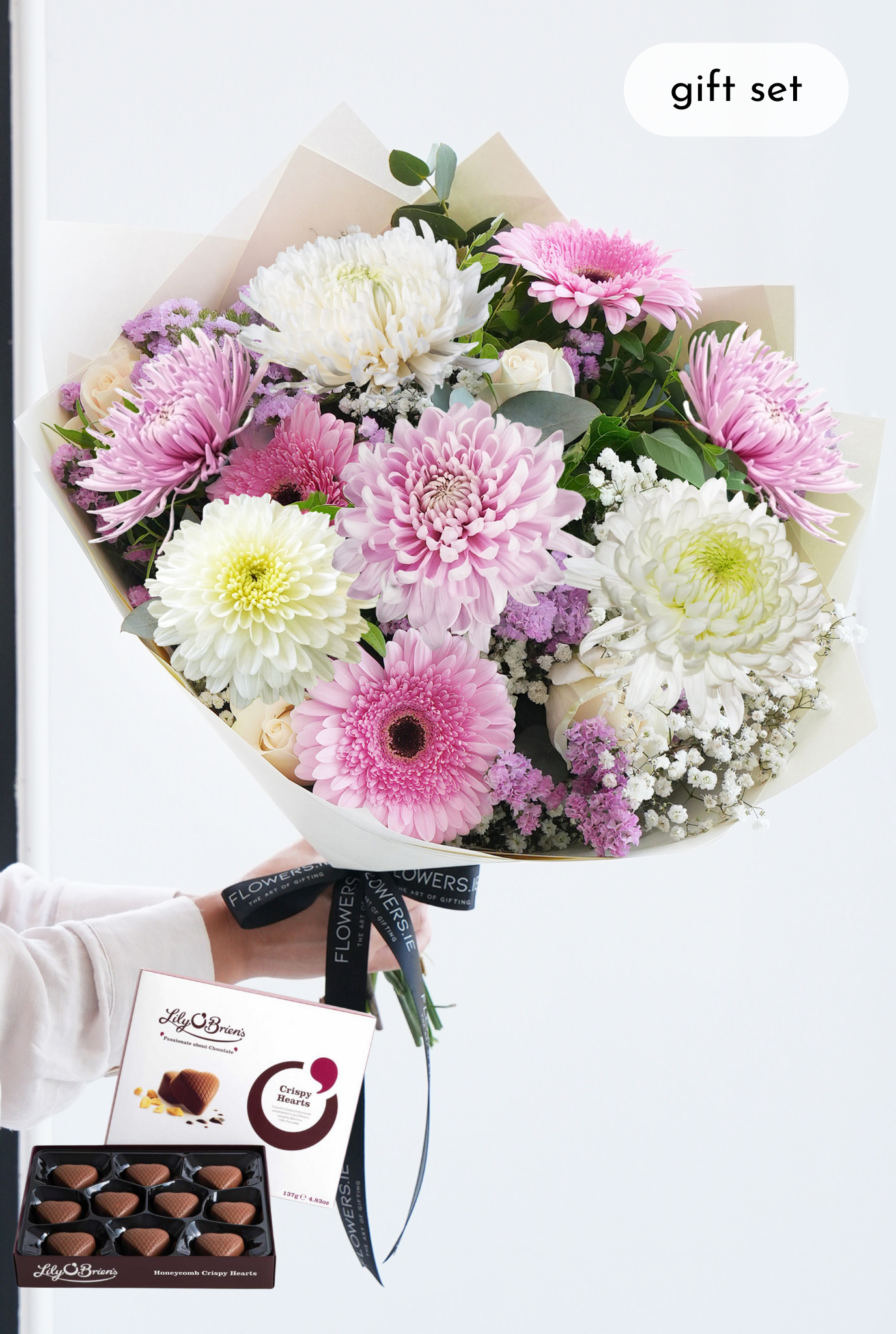 Make their birthday extra special with our Pastel Elegance Hand-tied bouquet. Featuring crisp white roses with soft white and pink chrysanthemums, gerberas, gypsophilia, and touches of statice, pistach, and eucalyptus, this pastel arrangement is a graceful way to brighten their big day.