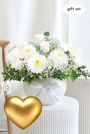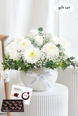 Celebrate their special day with a graceful mix of white roses, carnations, chrysanthemums, and gypsophilia, highlighted by pistach greenery and eucalyptus. Arranged in a ceramic bowl, this elegant design makes a beautiful birthday gift filled with charm and joy.