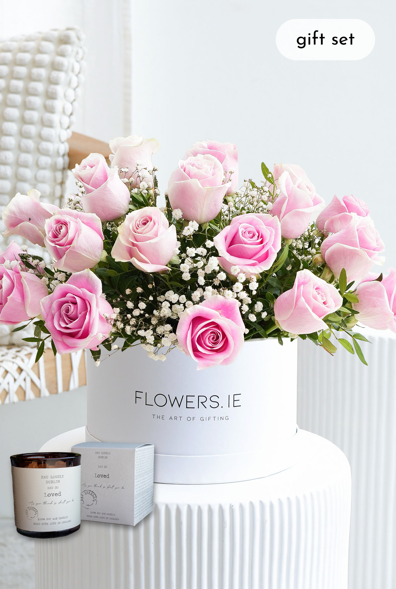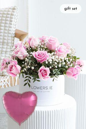 Introducing our lovely Blushing Beauty Hatbox, featuring delicate pink roses, charming gypsophila and elegant pistacia leaves.
