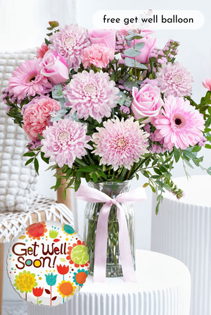 This beautiful vase arrangement comes with a Free Get Well Soon Balloon.