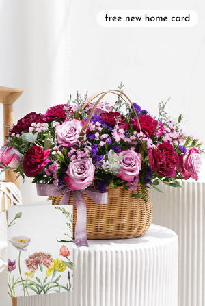 Celebrate a new home with our elegant Lavender Floral Basket — a graceful blend of purple roses, statice, carnations, and thistles with fresh greenery, bringing sophistication and charm to any space.