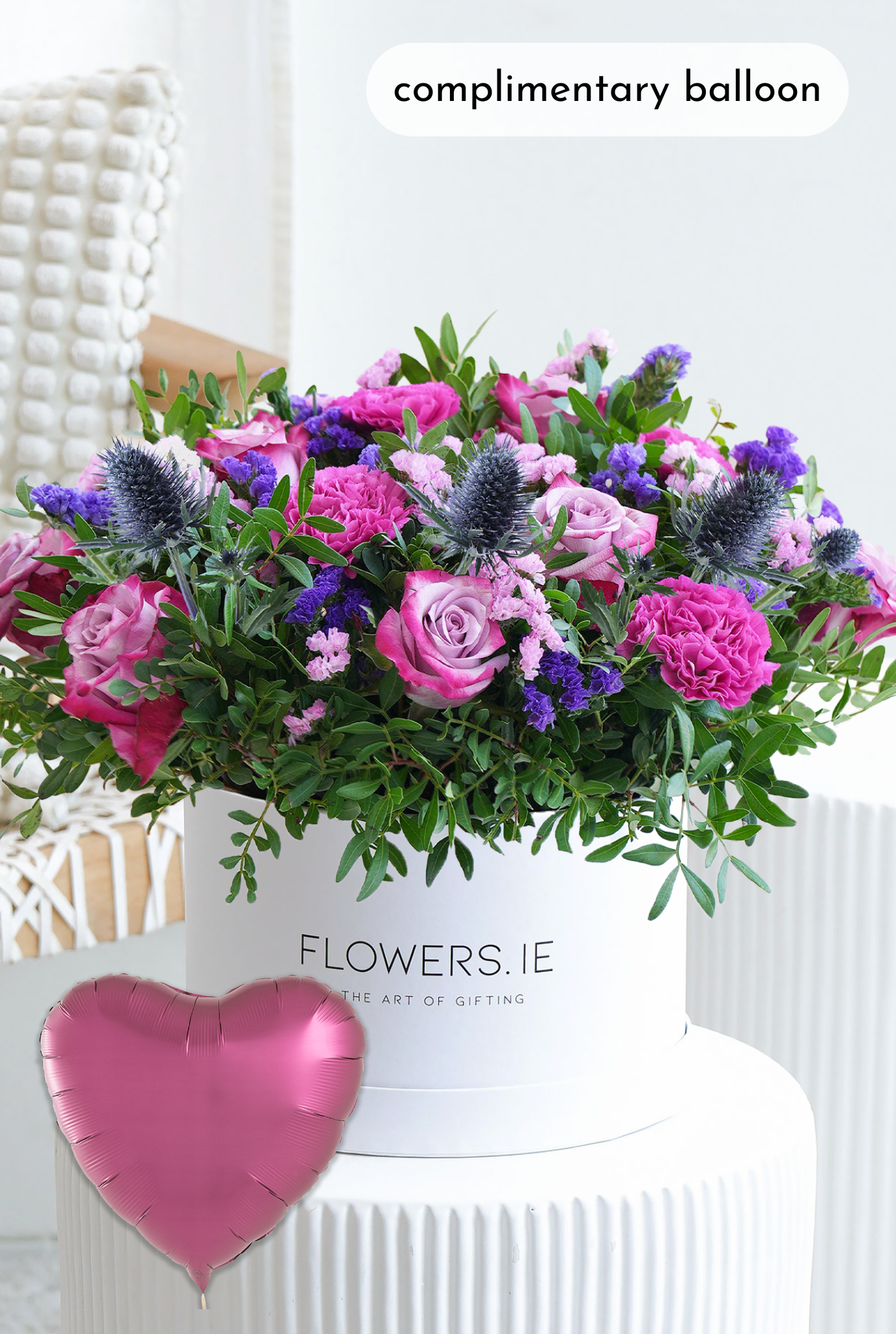 Experience the regal and majestic beauty of our "Lavender Floral Hatbox" arrangement, featuring luxurious deep purple roses, delicate blue statice, textured purple carnations, and thistles with pistacia leaves adding a touch of greenery. Perfect for any occasion, this arrangement exudes sophistication and elegance.