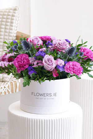 Experience the regal and majestic beauty of our "Lavender Floral Hatbox" arrangement, featuring luxurious deep purple roses, delicate blue statice, textured purple carnations, and thistles with pistacia leaves adding a touch of greenery. Perfect for any occasion, this arrangement exudes sophistication and elegance.