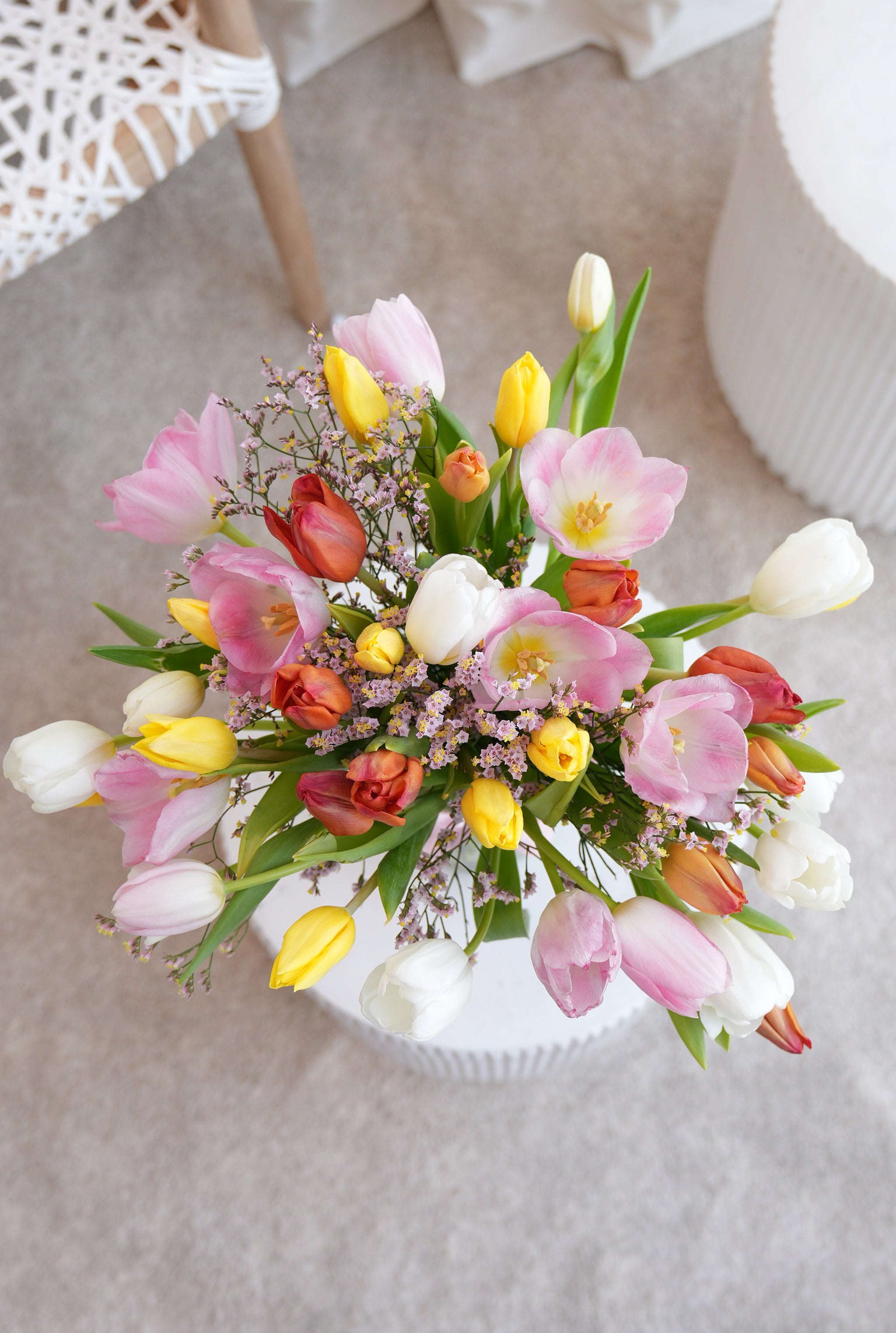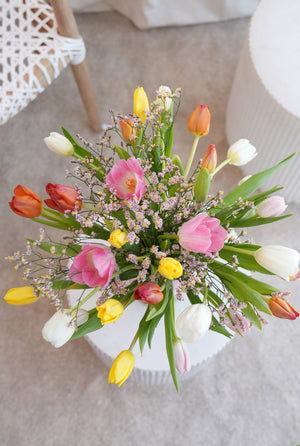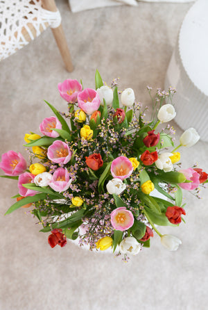 Brighten spring celebrations with a beautiful mix of tulips in assorted colours, paired with delicate gypsophila and elegantly arranged in a vase. Tulip colours are selected at random based on stock availability, making each bouquet uniquely charming.