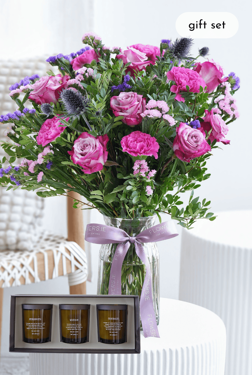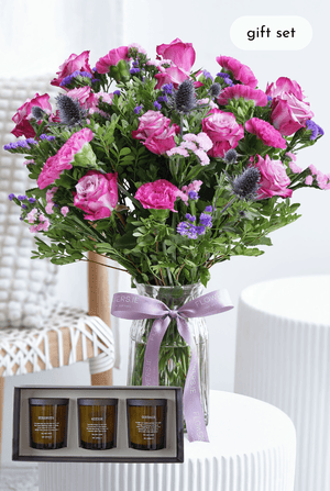 This arrangement comes with the Eau So Lovely 3-candle set.