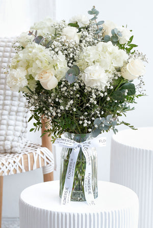Celebrate your Mam with the timeless elegance of our Mother’s Day Perfect White Vase—featuring white hydrangeas, roses, and gypsophila, beautifully accented with pistach and eucalyptus leaves. A pure and graceful gift, just like her!