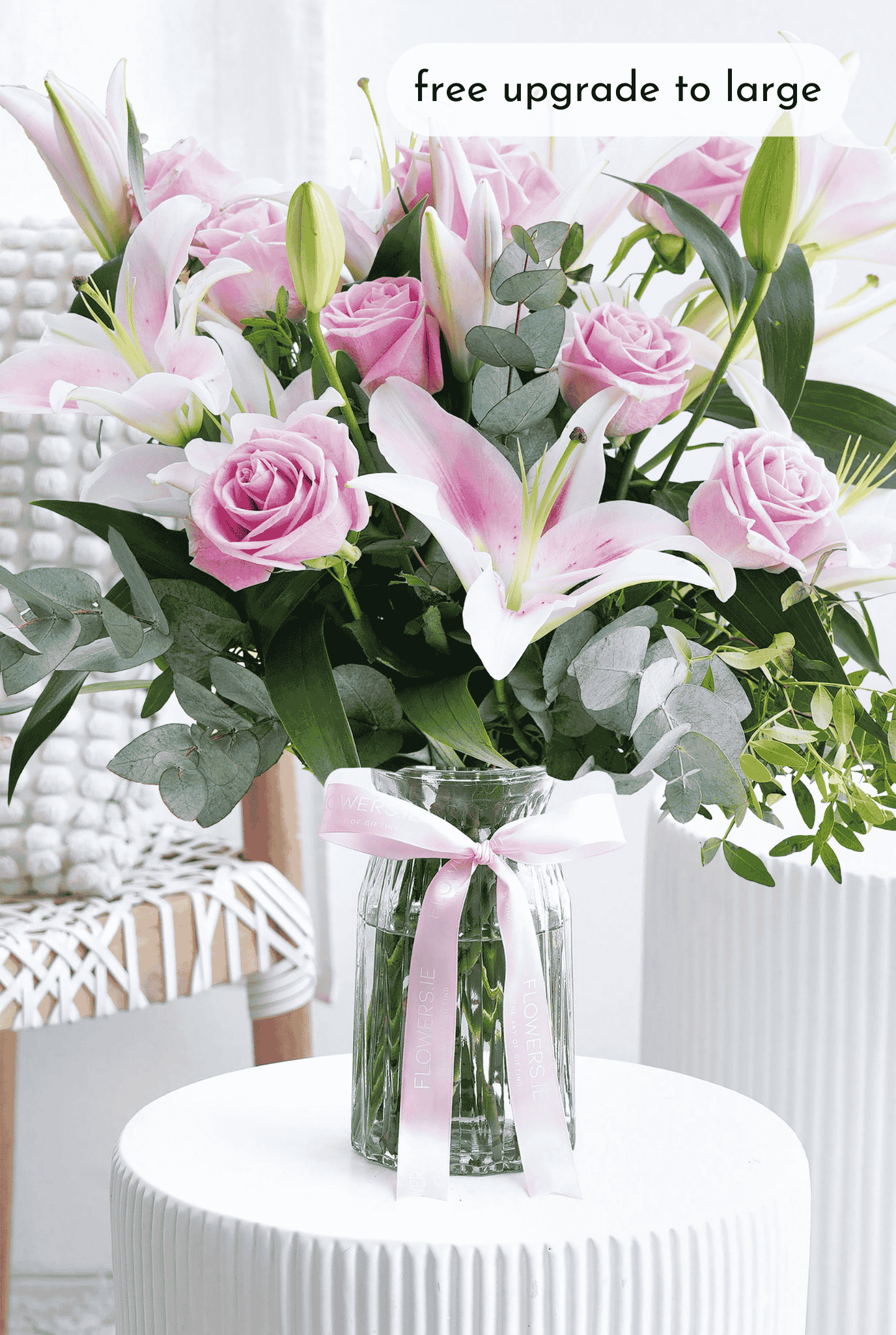 Celebrate your Mam with our Mother’s Day Romantic Pink Roses & Pink Lily Vase—featuring elegant pink roses and lilies, beautifully accented with pistach. A graceful and heartfelt gift to show your love!