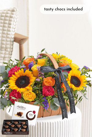 Bring a burst of vibrant beauty to Mother's Day with our Vibrant Basket in a charming basket, featuring sunflowers, yellow and orange large-headed roses, cerise carnations, and a delightful mix of blue and pink statice. With accents of solidago, pistash leaves, and eucalyptus leaves, this lively arrangement, adorned with a flowers.ie ribbon, is a radiant and thoughtful gift for the wonderful mothers who deserve to be celebrated.