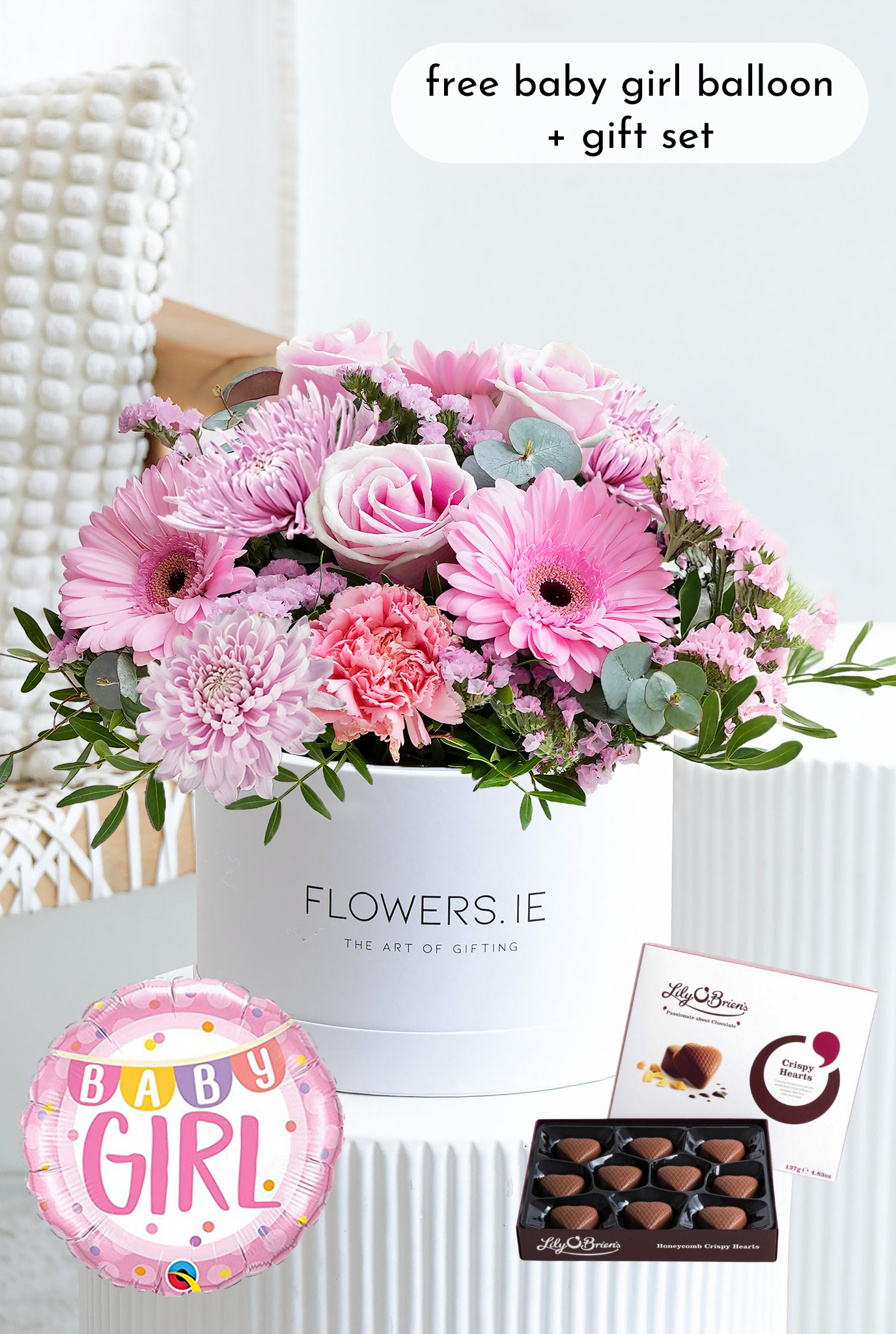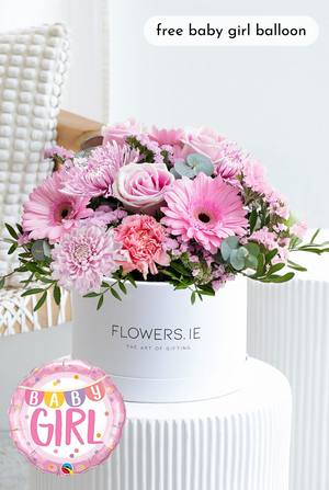 Welcome a precious new arrival with soft pink roses, delicate carnations, cheerful gerberas, and pale pink chrysanthemums, accented with layers of pink statice, pistach greenery, and eucalyptus. Presented in a signature hatbox, it’s a charming way to celebrate the joy of a baby girl.