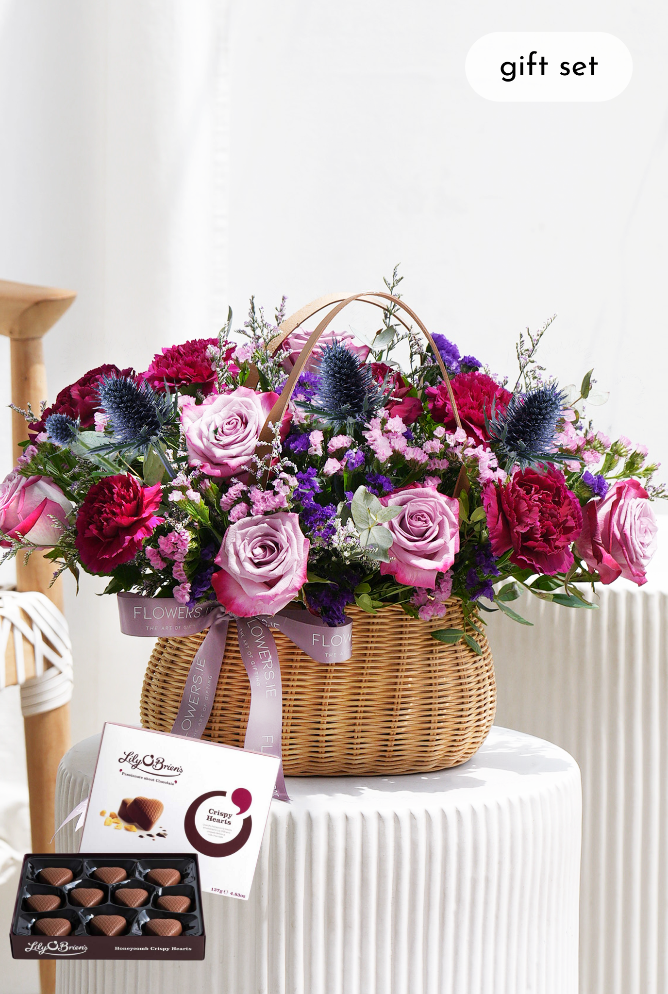 Experience the regal and majestic beauty of our "Lavender Floral Basket" arrangement, featuring luxurious deep purple roses, delicate blue statice, and textured purple carnations, thistles with pistach leaves adding a touch of greenery. Perfect for any occasion, this arrangement exudes sophistication and elegance.