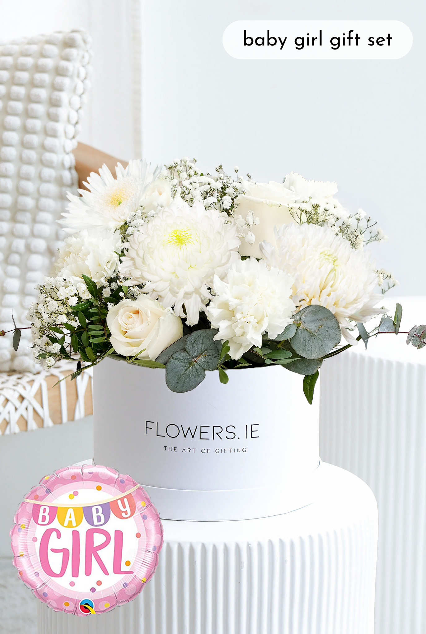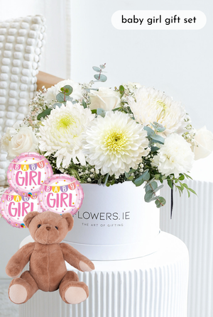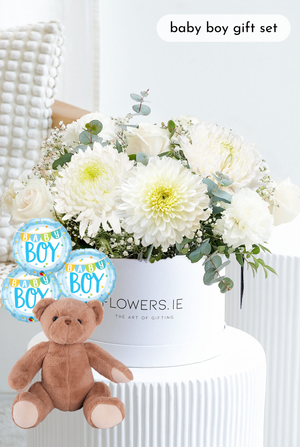 Celebrate the joy of new beginnings with this elegant hatbox arrangement of white roses, carnations, chrysanthemums, and gypsophilia, complemented by pistach greenery and eucalyptus. A thoughtful gift to welcome a newborn and share love with the happy family.