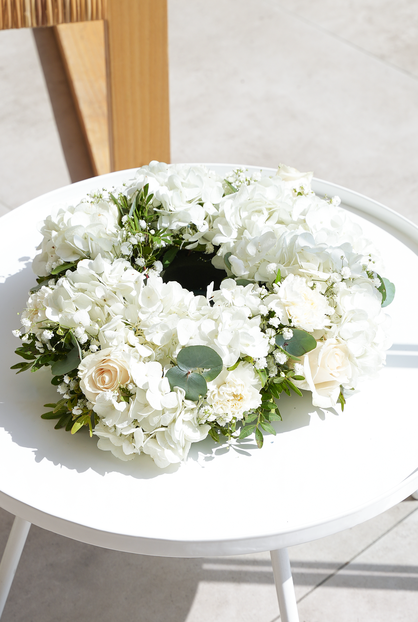 Perfect White Funeral Wreath features elegant white roses, carnations, and hydrangeas, softened by delicate gypsophilia. Accented with pistach greenery and eucalyptus, it is a timeless tribute that conveys peace, purity, and heartfelt sympathy.