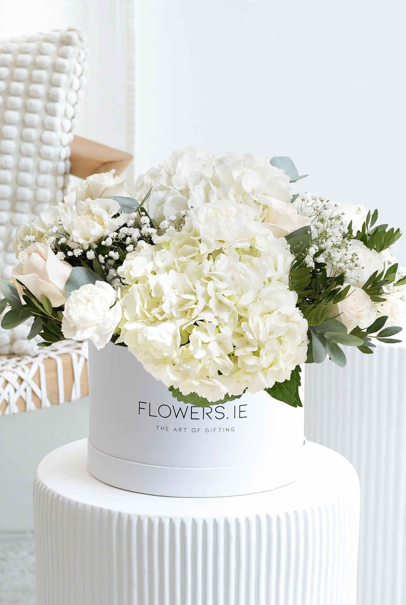 Indulge in the pure and serene beauty of our "Perfect White Hatbox" flower arrangement, featuring pristine white hydrangeas, classic white roses, delicate gypsophila, and fresh pistacia leaves. This elegant and timeless bouquet is the perfect way to brighten up any space and create a sense of peace and tranquility.