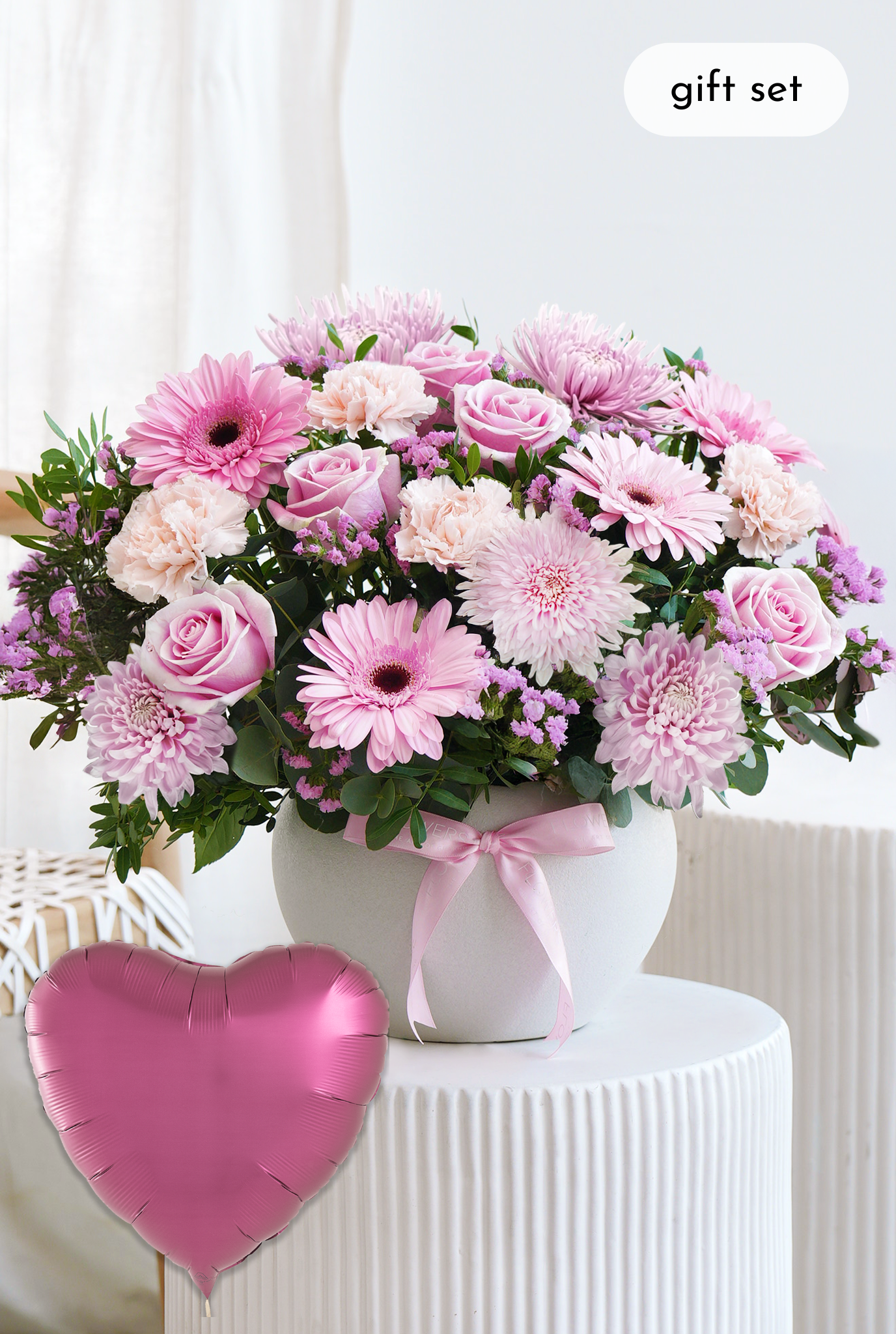 Experience luxury with radiant pink roses, delicate carnations, cheerful gerberas, and pale pink chrysanthemums, accented with pink statice, pistach greenery, and eucalyptus. Presented in a ceramic bowl, it’s perfect for milestone celebrations, luxury gifting, or elevating your home décor.