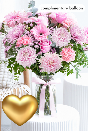 This arrangement comes with a complimentary gold balloon to match the occasion.
