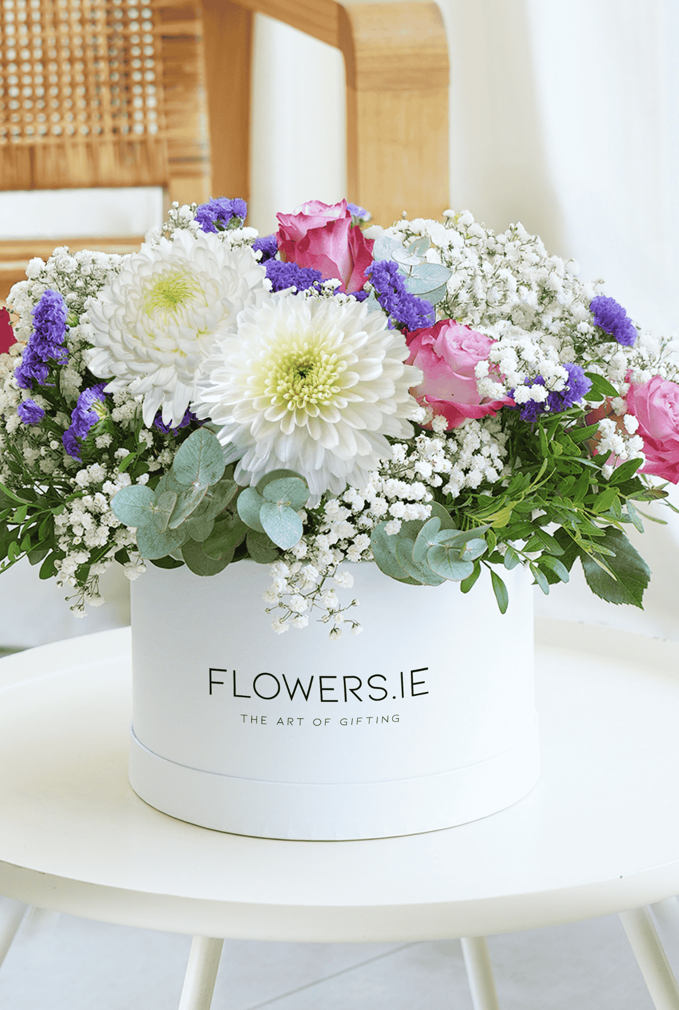 Indulge your senses in the rich hues of our Purple Passion Hatbox, featuring a captivating combination of white chrysanthemums, velvety purple roses, delicate blue statice, airy gypsophilia, and lush pistach leaves. This exquisite arrangement exudes a sense of charm and elegance, making it the perfect gift to express your love and admiration on special occasions, evoking the sentiments of affection and admiration that words alone cannot convey.