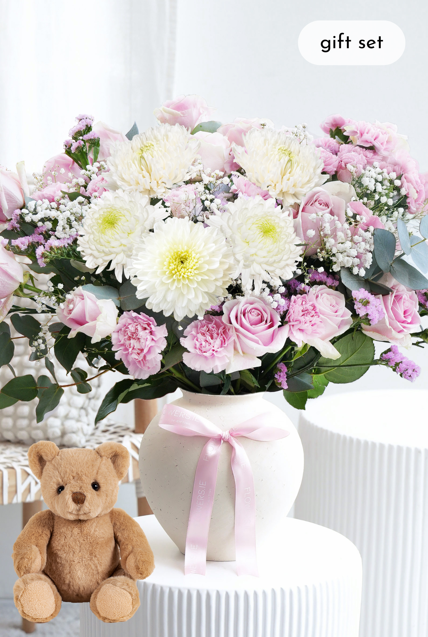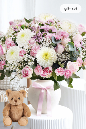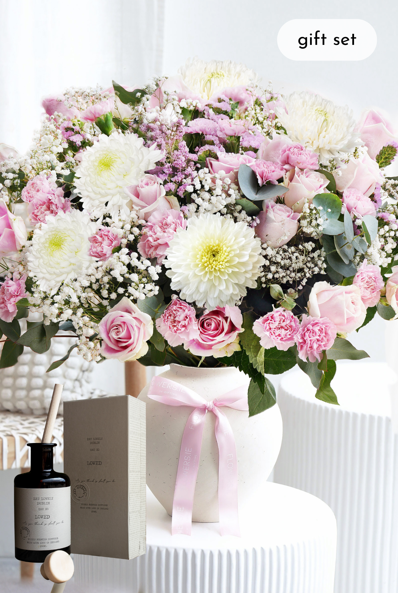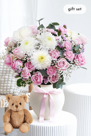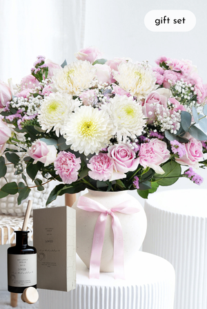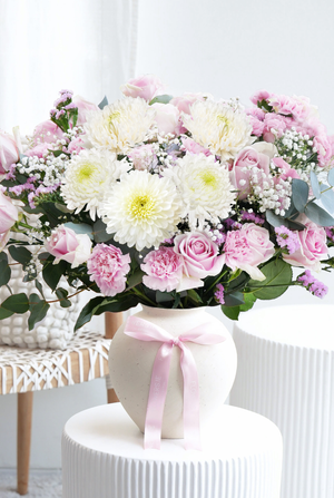 Express your heartfelt condolences with our Heaven Scent Vase. A gorgeous arrangement of pink roses, chrysanthemums, carnations, statice, gypsophila and eucalyptus leaves, this elegant and timeless bouquet offers a peaceful tribute and brings comfort during a difficult time.