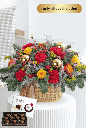 Experience the magic of Christmas with our Vibrant Christmas Basket, featuring orange and yellow roses, cerise carnations, solidago, pink statice, red ilex berries, blue thistle, and rose gold asparagus fern, finished with noblis fir and red baubles. The perfect holiday gift!