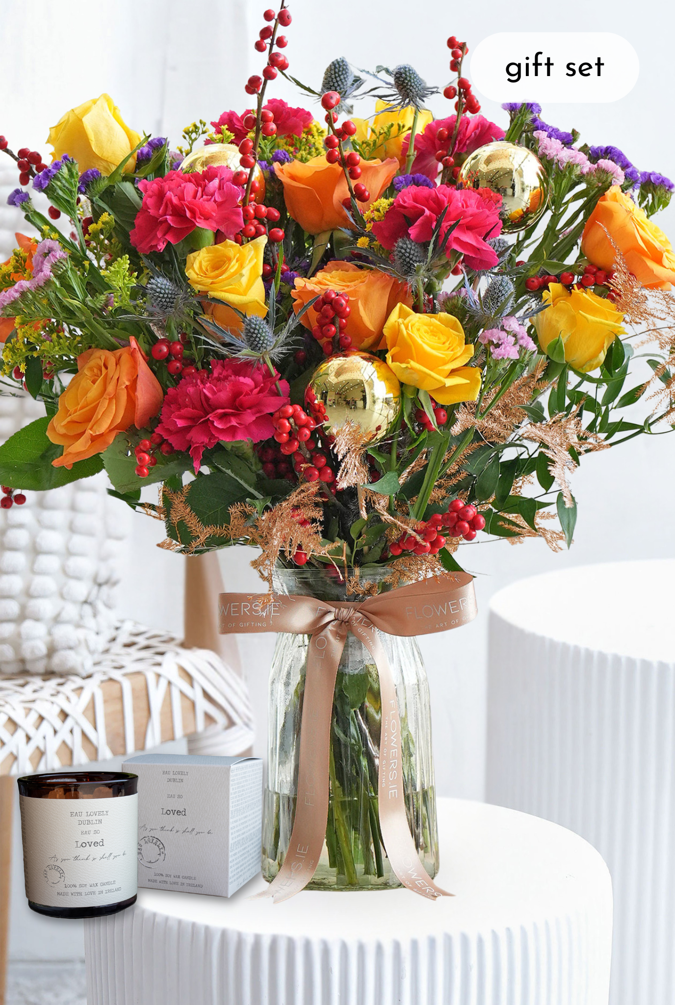 This arrangement includes a Eau So Loved Candle.