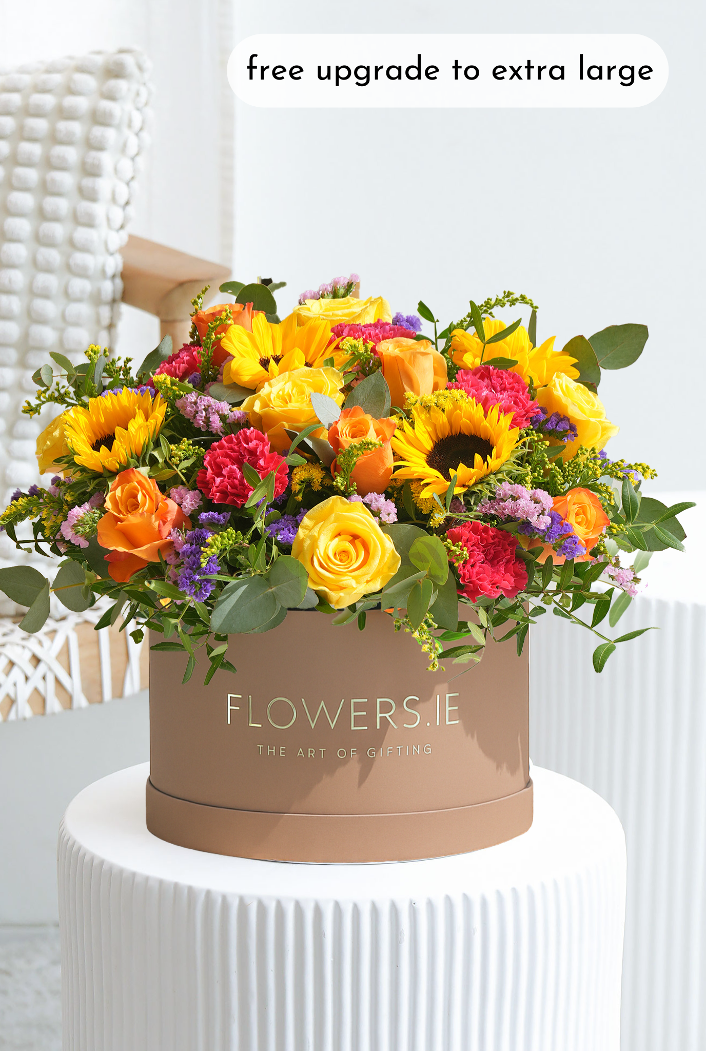 Brighten up any room with our "Vibrant Hatbox" arrangement, featuring stunning sunflowers, blue and pink statice, and vibrant yellow and orange roses. This cheerful arrangement is sure to bring joy and happiness to any occasion.