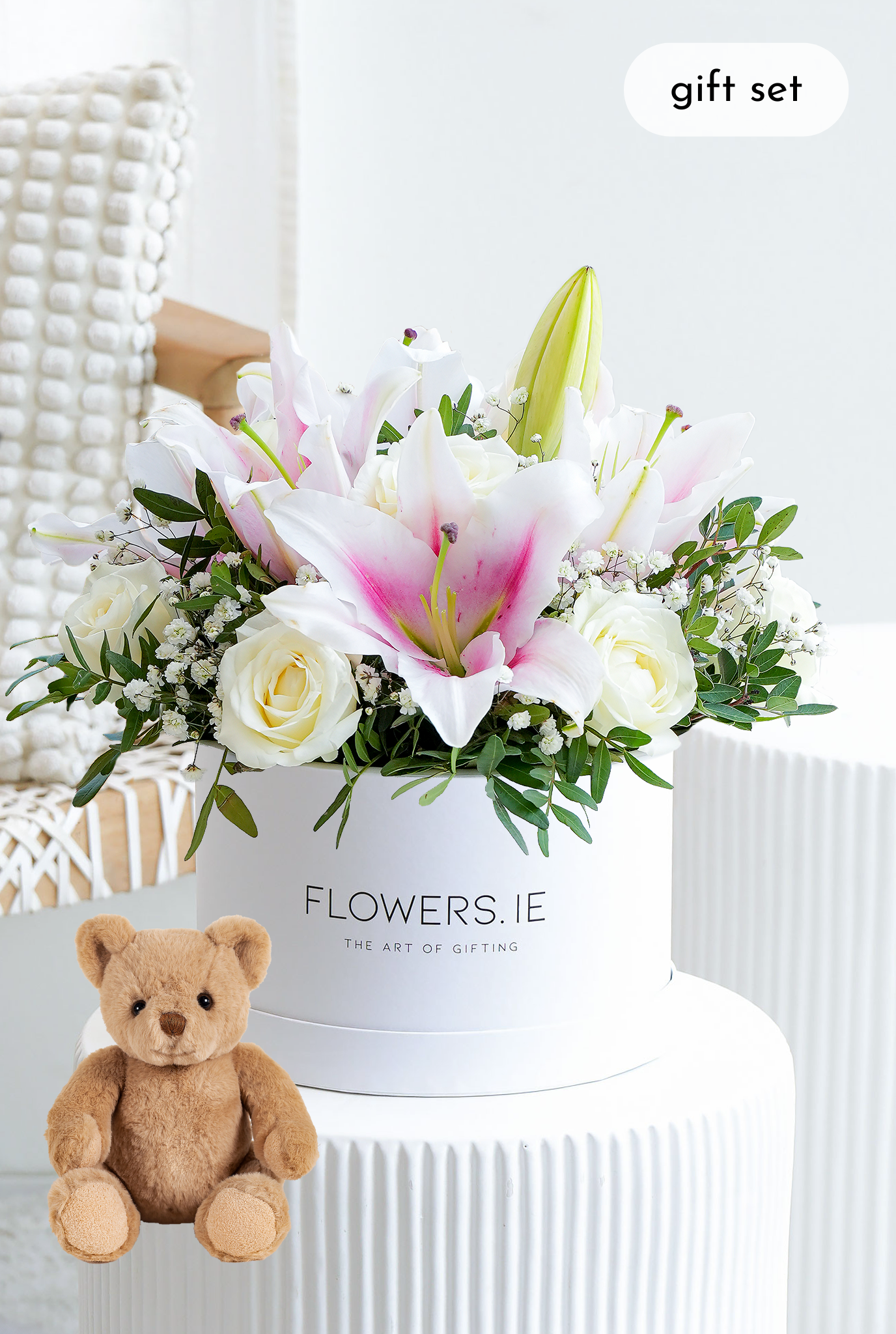 Elevate your floral gifting with our exquisite White Roses and Pink Lily Hatbox, a stunning arrangement that combines the timeless elegance of white roses with the delicate charm of pink lilies. Nestled in a chic hatbox, this harmonious blend of blooms is not only a feast for the eyes but also a heartfelt gesture for any occasion.