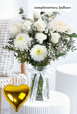 Welcome back with timeless grace — white roses, carnations, chrysanthemums, and gypsophilia, elegantly arranged with pistach greenery and eucalyptus, symbolizing purity, love, and new beginnings.