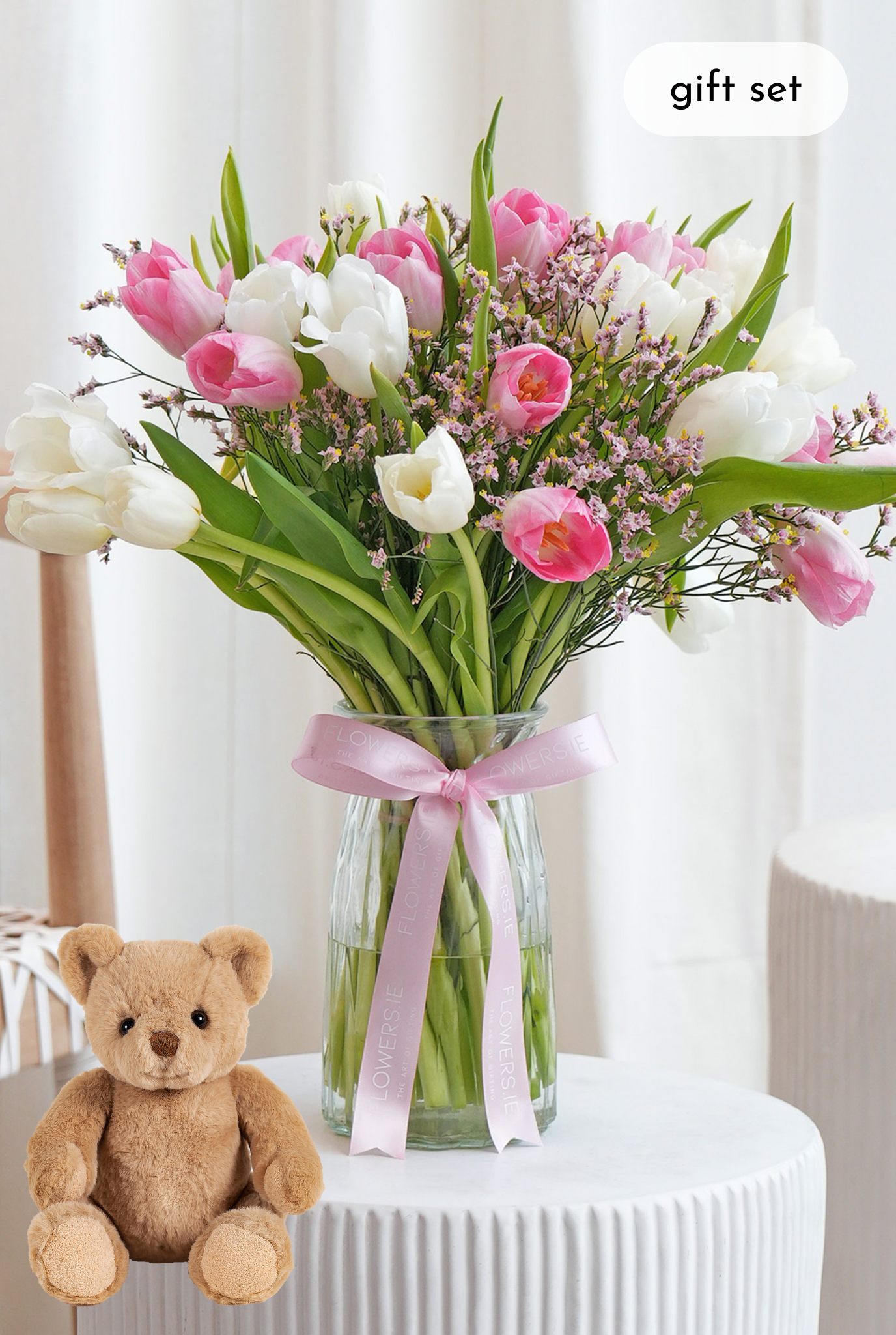 Soft, elegant, and full of charm! Our Women’s Day Pink & White Tulips - Vase is the perfect blend of beauty and grace, symbolising love and appreciation. A luxurious gift to make her day extra special!